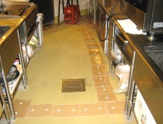 現場の調査を実施します。店舗の構造やネズミの発生状況、ラットサイン(ネズミが通った汚れ等の形跡)を調査したうえで、初期施工で実施する粘着マットの設置作業等の方法や流れを検討し、初期施工に移ります。 |